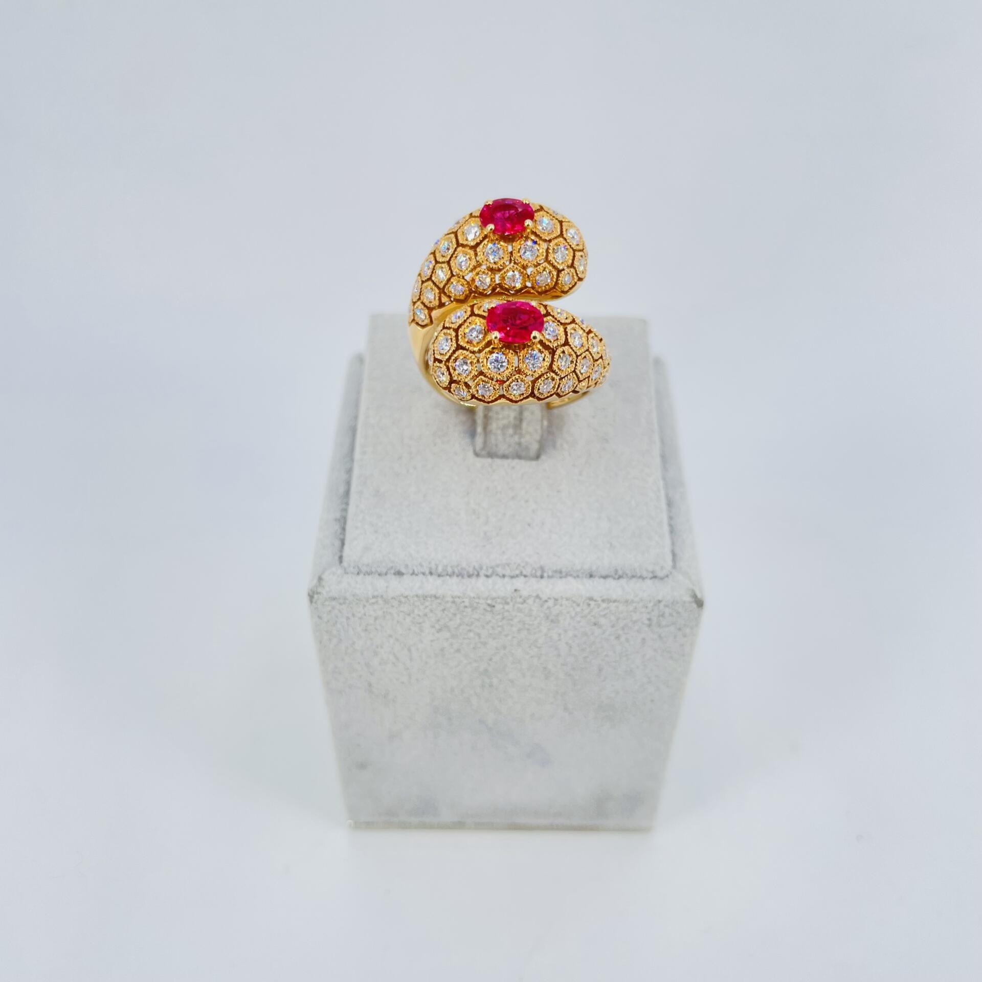 Anello contrarié in oro giallo 18KT (750) con corindoni naturali varietà rubino e diamanti naturali