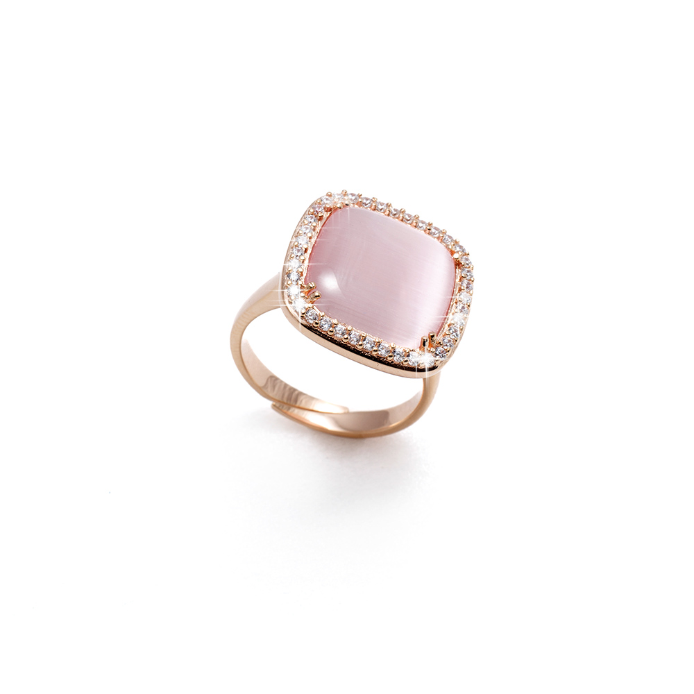 Anello in arg925 rodiato in oro rosa regolabile con quarzo rosa naturale e zirconia