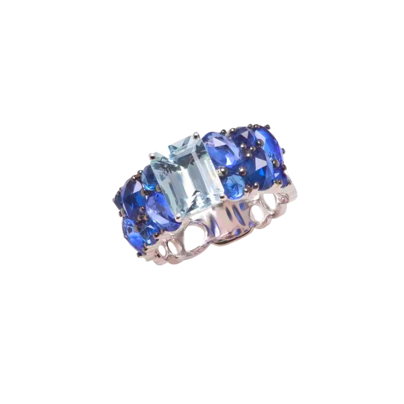 Anello in oro bianco 18KT (750) con berillo naturale varietà acquamarina e corindoni naturali varietà zaffiro