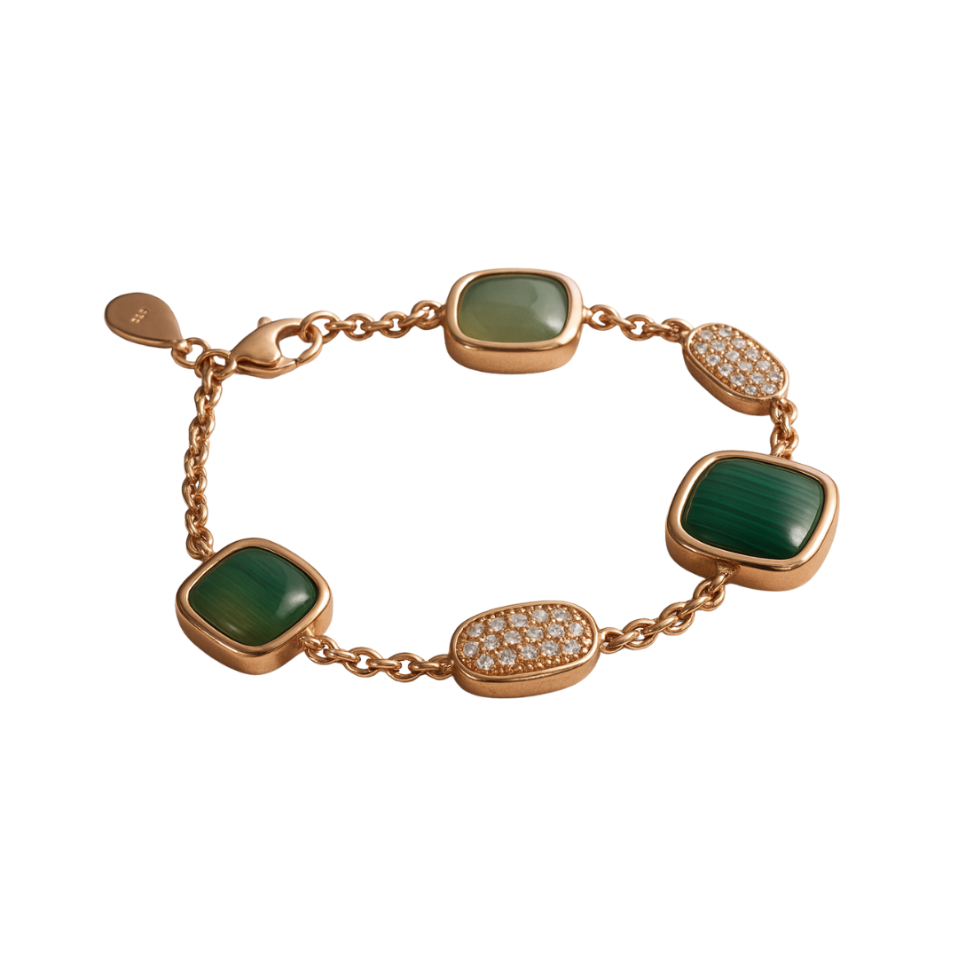 Bracciale in argento 925 rodiato in oro rosa con malachite naturale, quarzi verdi naturali e zirconia.