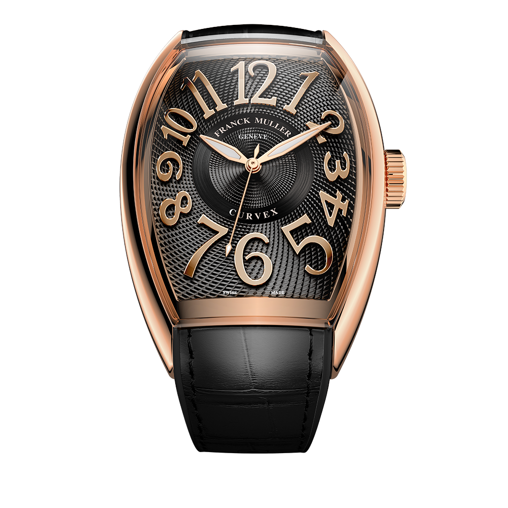 Orologio firmato Franck Muller in oro rosa 18KT con vetro zaffiro, quadrante nero, numeri arabi in oro rosa e cinturino in pelle di coccodrillo di colore nero.