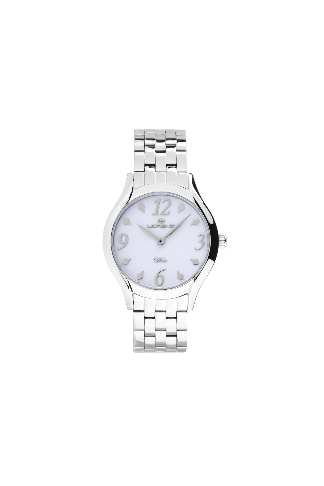 Quadrante bianco, impreziosito da ore arabe e indici protetto da vetro minerale.