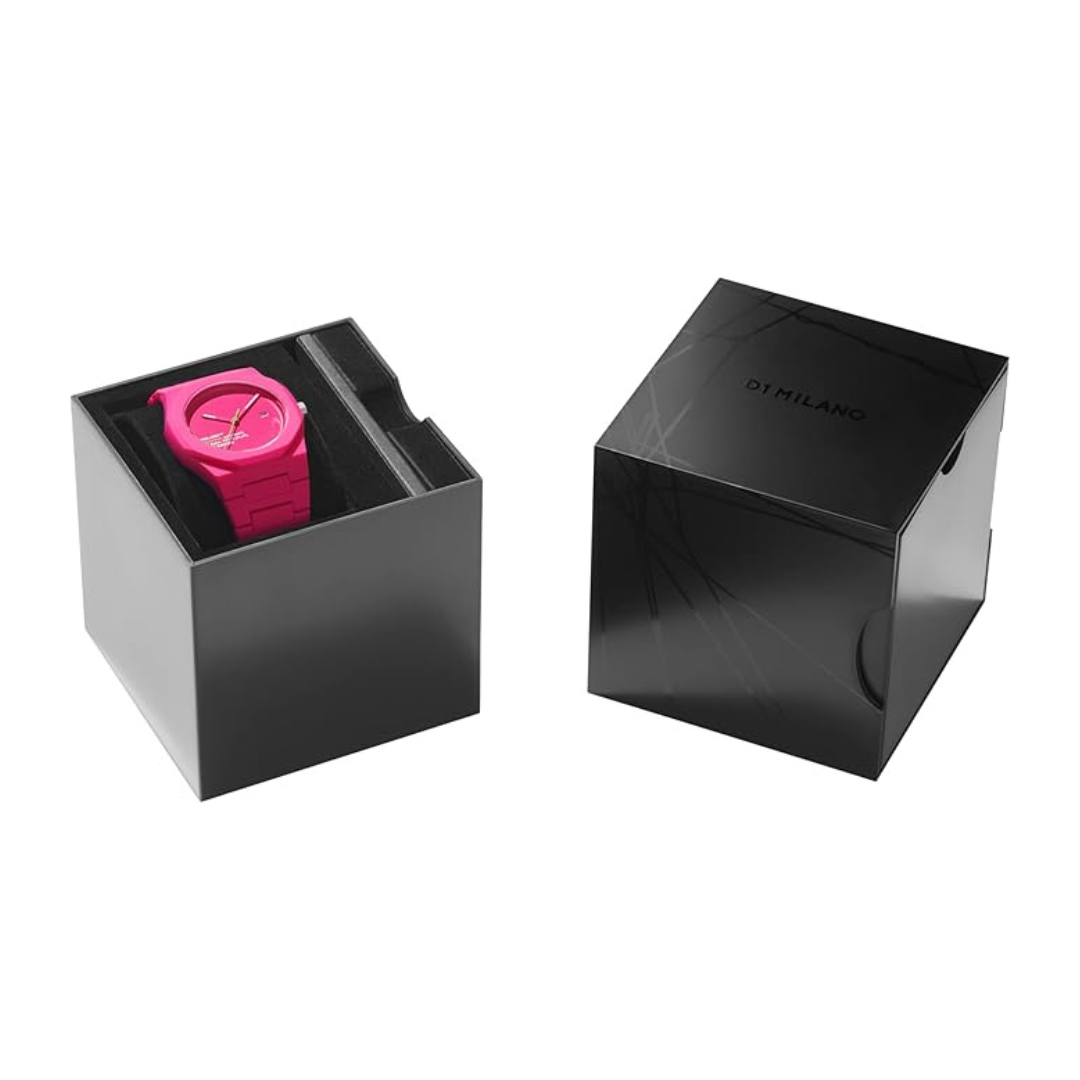 Orologio firmato D1 Milano in policarbonato ultra leggero di colore rosa acceso.