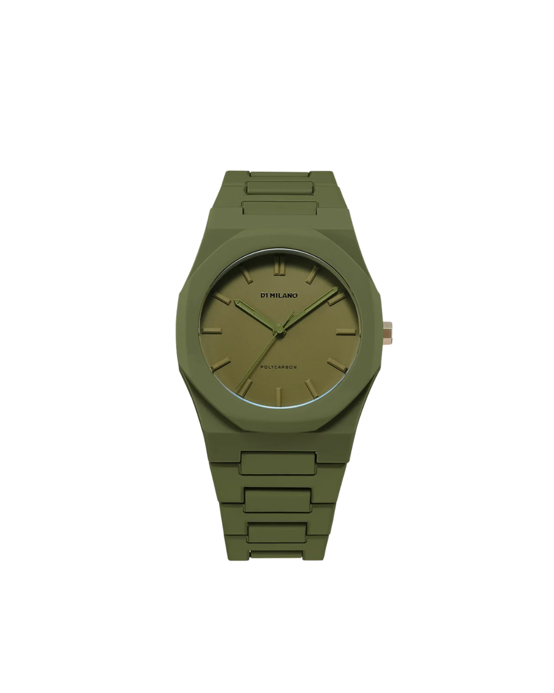 Orologio firmato D1 Milano in policarbonato ultra leggero di colore verde militare.
