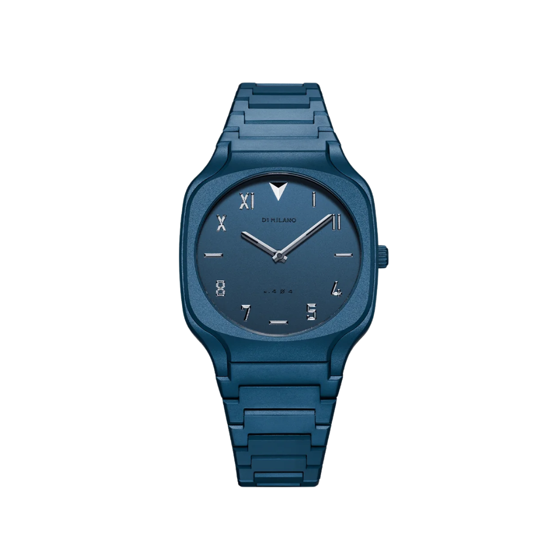 Orologio firmato D1 Milano di forma quadrata in acciaio inossidabile di colore blu.