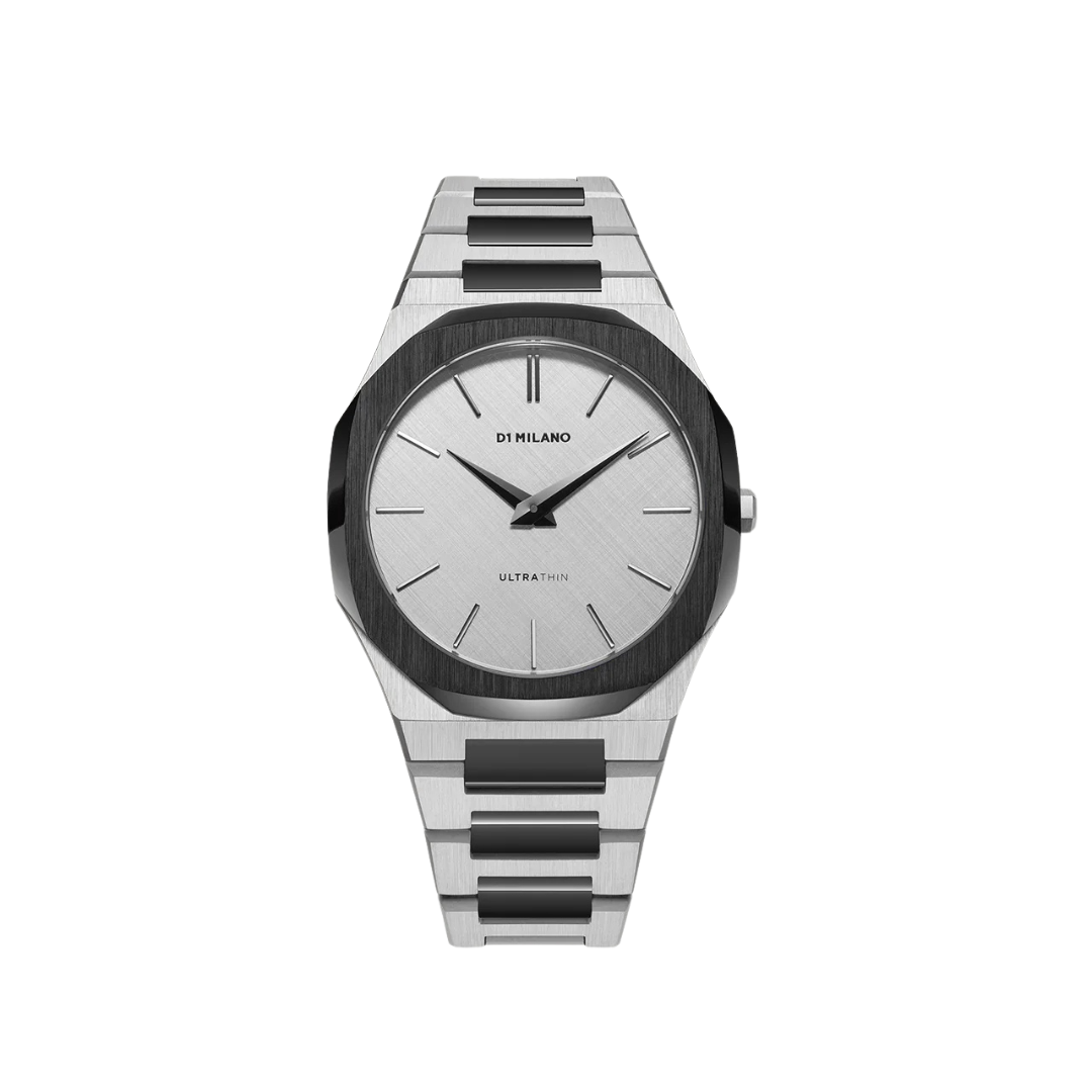 Orologio firmato D1 Milano ultra fine in acciaio argentato con elementi di colore nero.